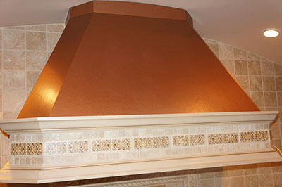 At a booth at a home show in Providence, RI, Paul met with the clients for the featured Barrington RI, residential project. The owners of the 6,600 square-foot home wanted to incorporate the style of Napa Valley in California, a region where they formerly resided. They chose decorative finishes for eight areas of the home, including a two-tone Lusterstone® harlequin pattern for a barrel-truss foyer ceiling, and a faux copper range hood for an indoor grilling area.